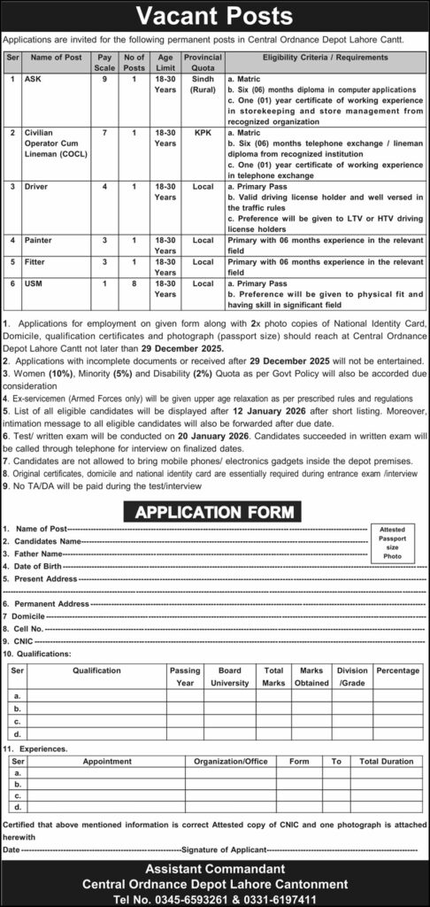 How to Apply for Central Ordnance Depot COD Lahore Cantt Jobs 2025