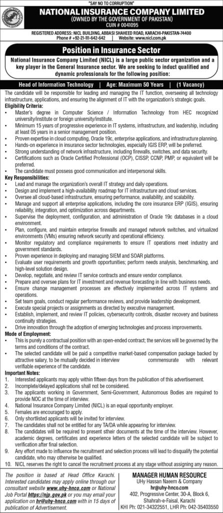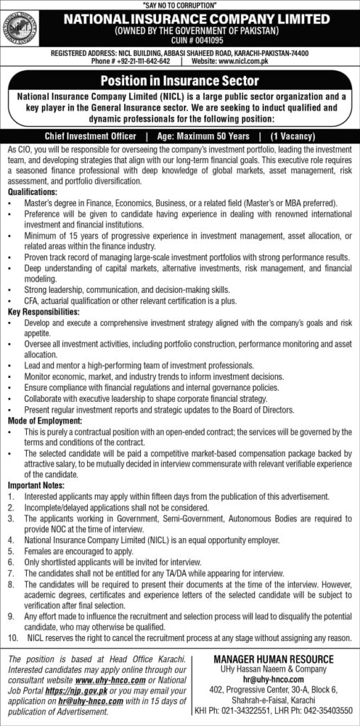 The National Insurance Company Limited (NICL) has highlighted the job opportunities for talented individuals in Karachi, Sindh, Pakistan. This career boosting opportunity was posted on 26 August 2026 in the Khabrian Newspaper. This recruitment drive is inviting individuals for multiple roles, including the Head of Information Technology, Executive Director, Chief Investment Officer, and Chief Internal Auditor. National Insurance Company Limited has offered a chance to make the future bright who are seeking a career with growth and stability. If you join the National Insurance Company Limited, you will be a part of the organization that offers you the chance to contribute to the betterment of the insurance company. The eligibility criteria for the roles are straightforward; to join the National Insurance Company Limited, the minimum requirement is the degree of a Bachelor. The educational qualifications for each role are different. For accurate information, please read the eligibility criteria below.  If you have a Bachelor’s or Master’s degree, then you can apply smoothly.