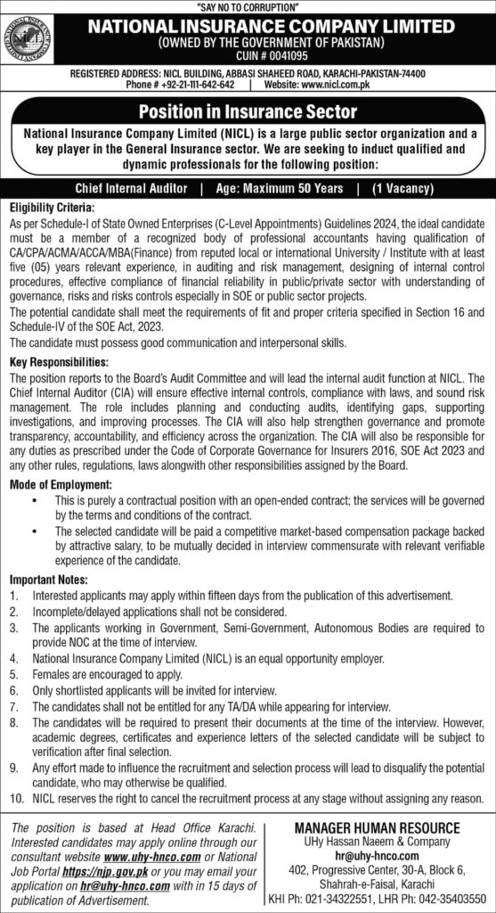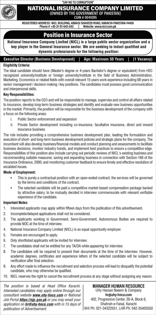 Quick information for National Insurance Company Limited NICL Karachi Job 2025